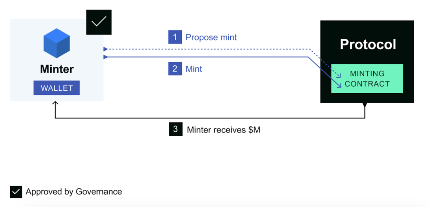 This request is subject to a Mint Delay period, during which any Validator may cancel the transaction if the collateral conditions are not met. Once the delay has passed and all Core Operating Conditions are validated, the Minter can execute the mint and $M is issued to the designated address.