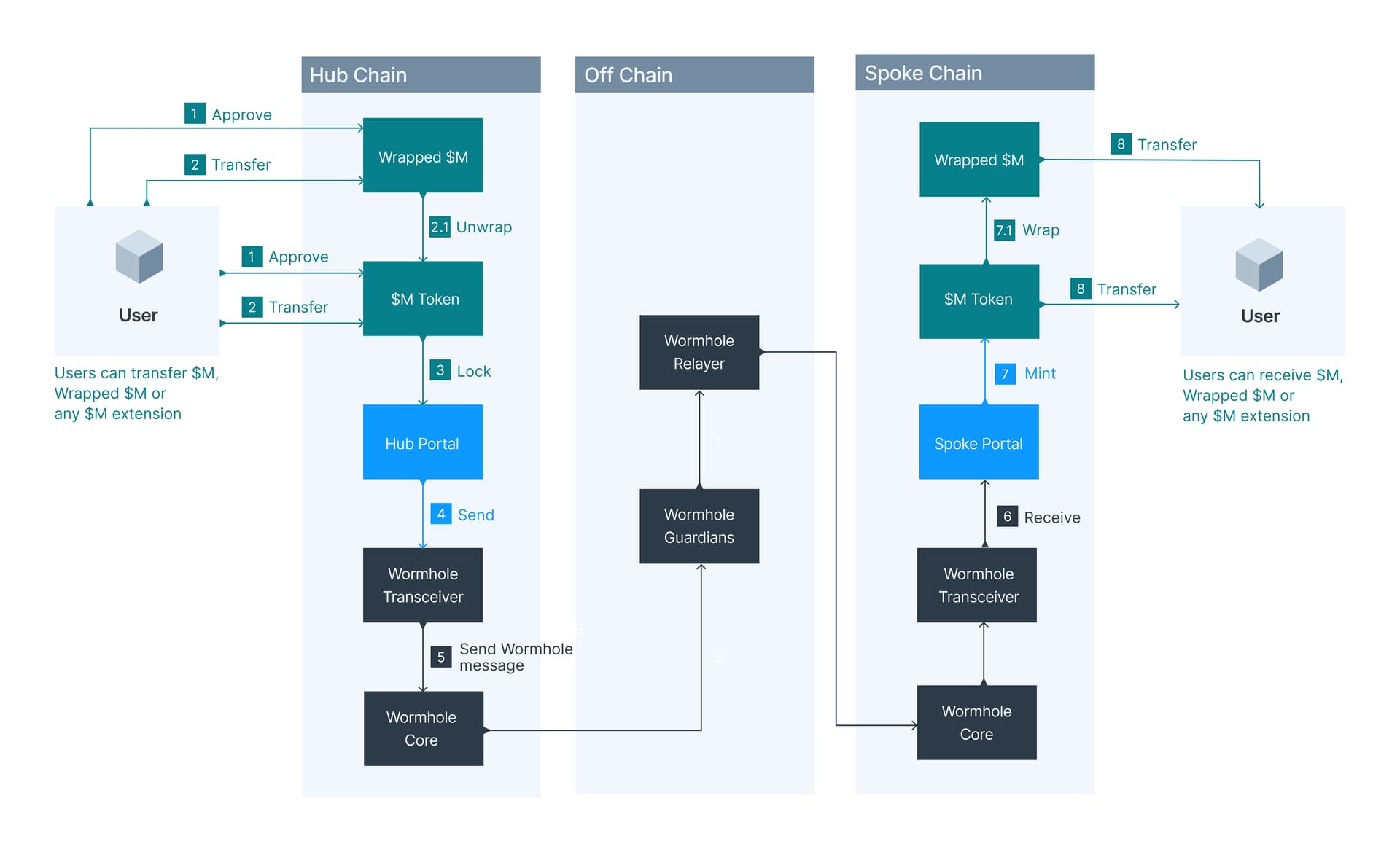 Overall, this architecture enables hub-to-spoke, spoke-to-hub and even spoke-to-spoke bridging, while maintaining full supply integrity across the M0 ecosystem.