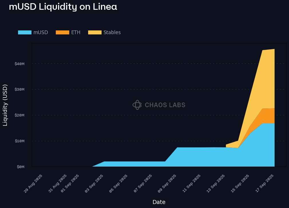 This rapid growth in liquidity has been driven in part by the Linea Ignition program, which began on September 15th and is scheduled to run until October 27th. The program incentivizes liquidity provisioning and has significantly deepened liquidity for mUSD. The duration and reward allocation of the program may be extended or adjusted.