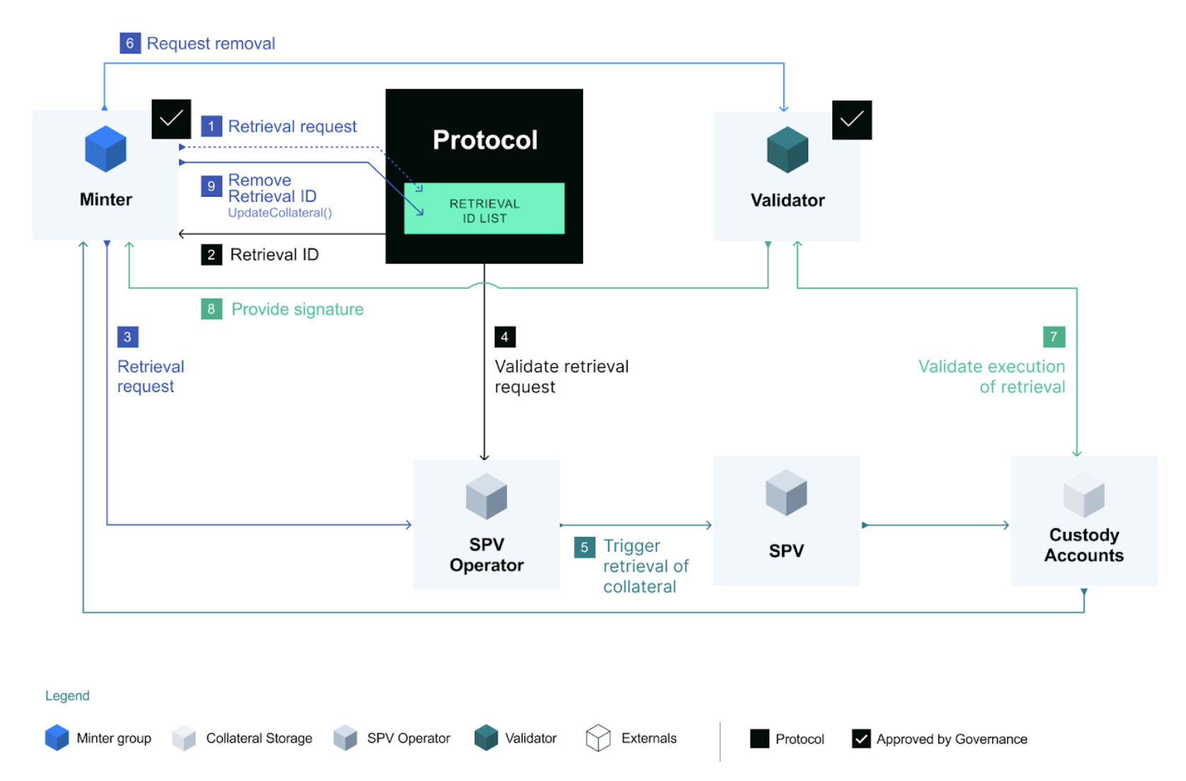 An SPV Operator then facilitates the liquidation of the collateral held in custody and transfers the funds to the Minter. Once confirmed, a Validator signs off on the removal of the RetrievalID, and the collateral is officially released from the system.