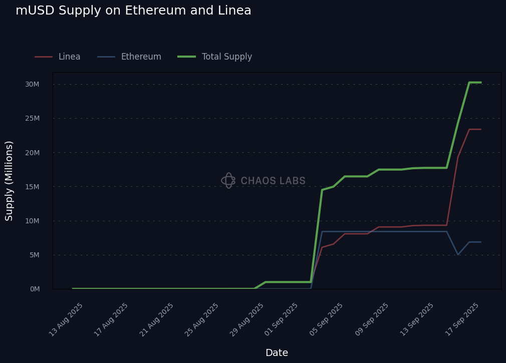 As of mid-September 2025, mUSD has reached a total supply of over 30 million, with most of the growth occurring since the beginning of the month. The supply is split across two chains: