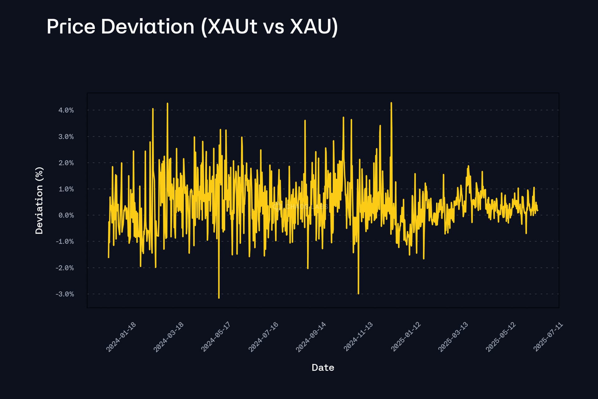 These deviations are primarily driven by the structural difference between XAUt’s continuous trading on crypto exchanges and the limited operating hours of traditional gold markets. While physical gold does not trade on weekends, XAUt remains fully tradable around the clock. This mismatch can lead to temporary price gaps during off-market hours, when no real-time benchmark is available from the gold market. During such periods, XAUt may diverge from the spot price of gold, with the peg typically re-aligning once traditional markets reopen. As shown below, the largest recorded deviation we observed reached approximately 4.5%.