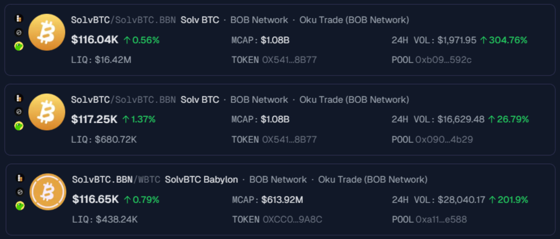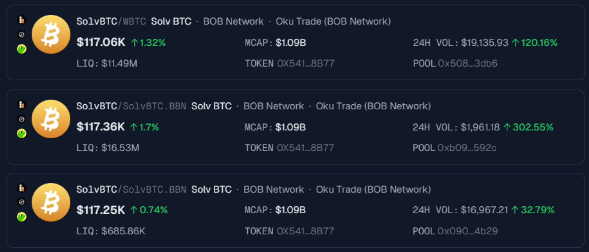 There are three primary liquidity pools for xSolvBTC on the BOB network. Two of these are paired with solvBTC, comprising approximately $16 million in total liquidity. However, these pools have recently become redundant, as xSolvBTC and solvBTC can already be converted atomically via the protocol. As a result, they no longer provide a meaningful enhancement to xSolvBTC’s standalone liquidity.