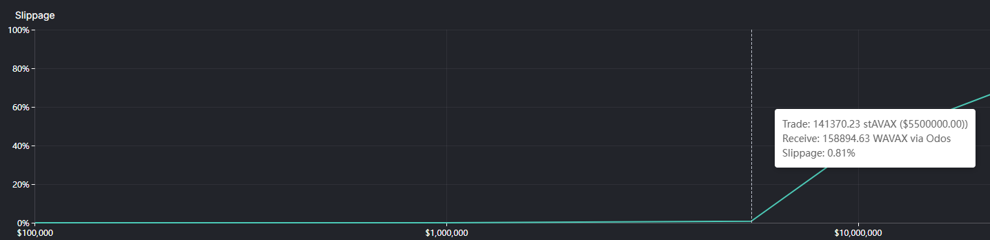 Liquidity is relatively low, with 8800 stAVAX (~$192K) that can be swapped within a ~7.5% price impact for WAVAX. This represents a significant decline from our initial analysis from $13M swappable within a ~7% price impact.