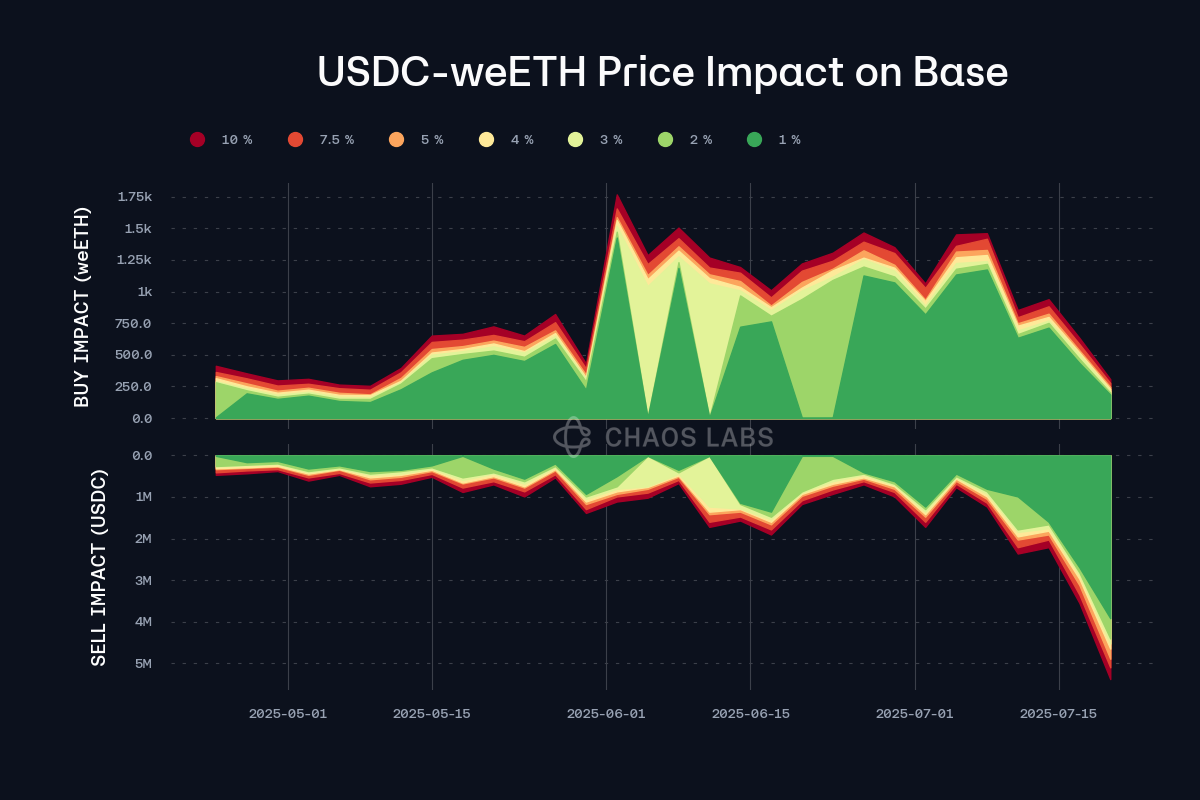 USDT’s liquidity against USDC has decreased somewhat since May, though it is still sufficient to recommend a supply cap increase for this market.