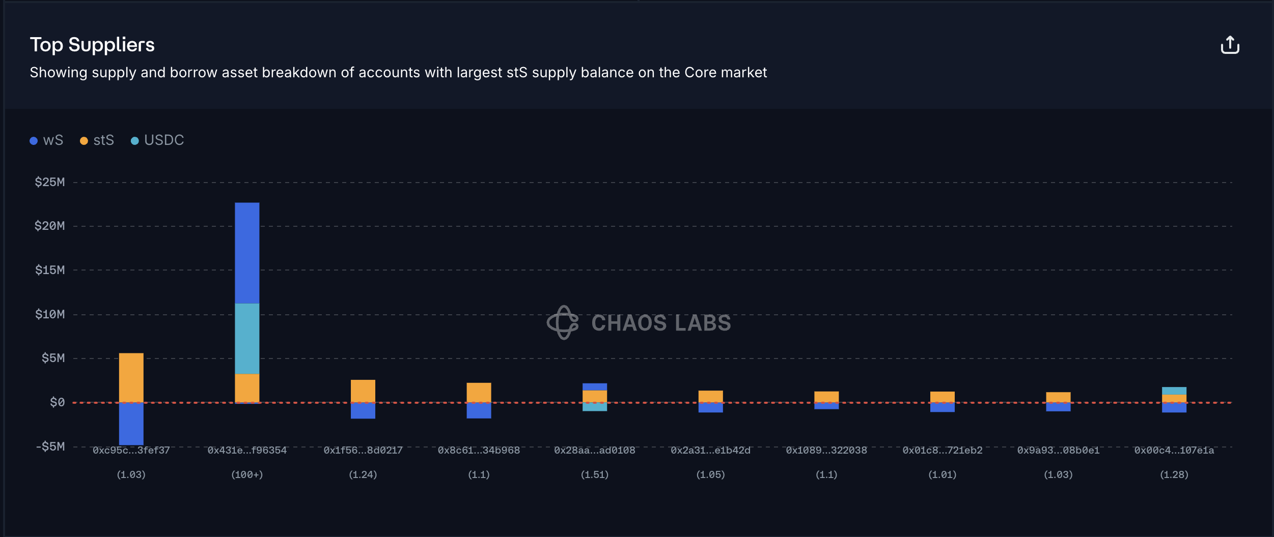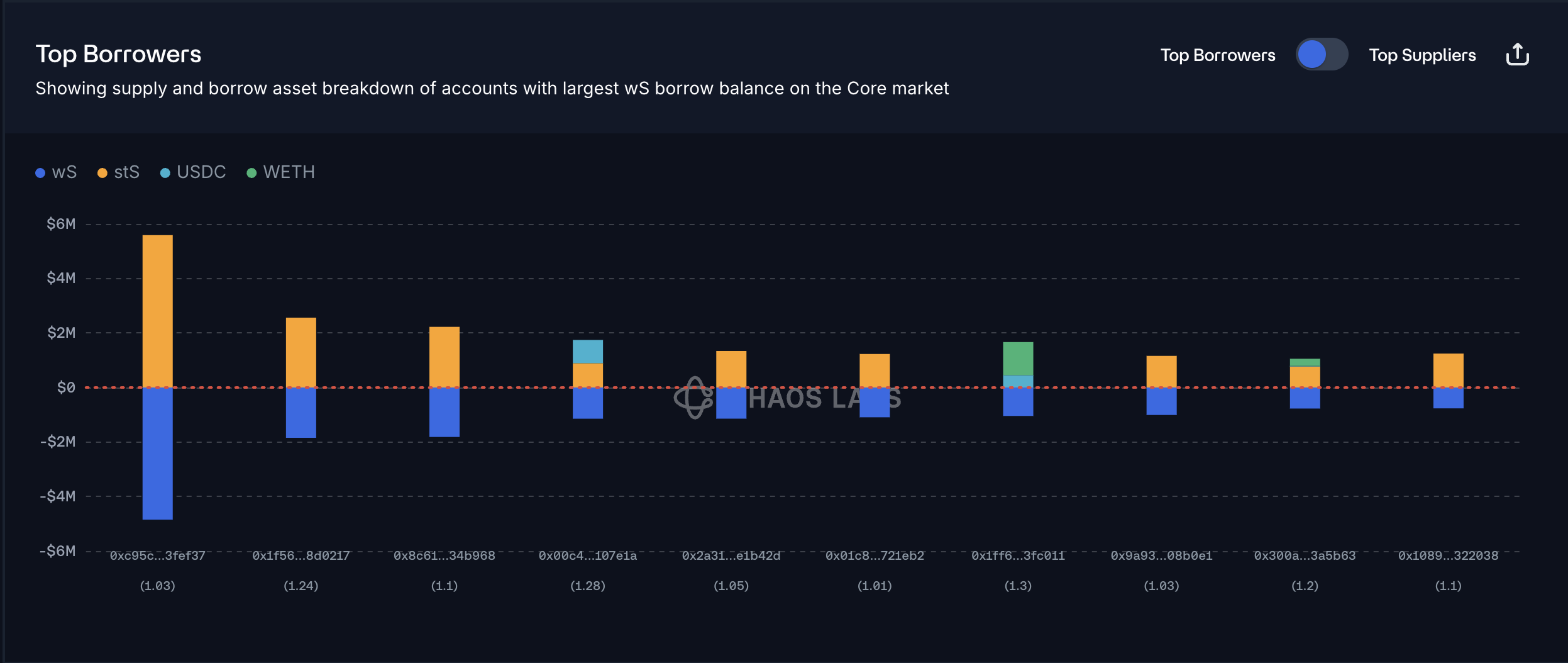 The borrow distribution of wS also presents limited immediate liquidation risk, as 9 out of the top 10 borrowers are collateralizing stS to borrow wS. The only position collateralizing uncorrelated assets currently maintains a health score of 1.3, further reducing the likelihood of liquidation.