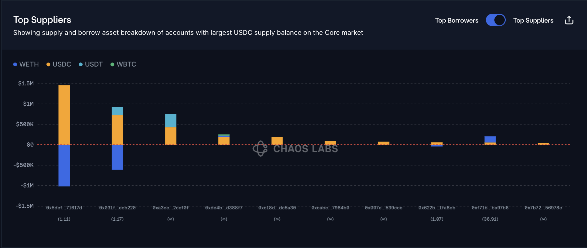 USDC’s supply distribution is moderately concentrated, with the top supplier representing approximately 18% of the market, while the top 50 positions account for a cumulative share of 50%. A small portion of the top suppliers have significant debt with health factors in the 1.11-1.17 range, while the majority have no debt at all, significantly reducing the risk of large-scale liquidations.