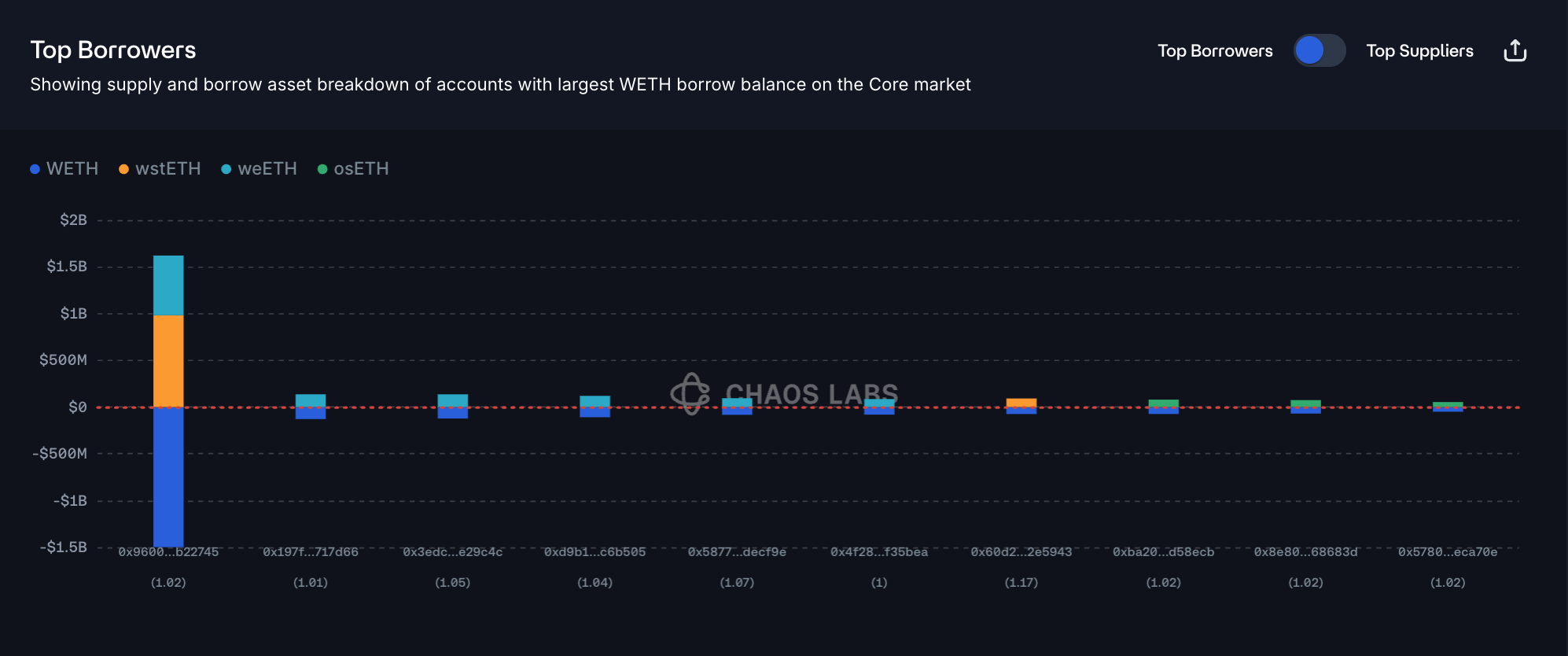 Consistent with other WETH markets, borrowing activity is predominantly driven by LST/LRT collateral. Borrow positions are more concentrated than the supply side, with the largest borrower holding just over 25% of total outstanding debt and the top 5 accounts collectively representing around 33% of all borrowing. The distribution of health factors aligns with typical WETH leverage profiles. As users rely on ETH-correlated E-Mode configurations and operate at near maximum leverage, health factors cluster around 1.02. While this level of leverage would ordinarily be considered high risk, the strong correlation between collateral and debt significantly reduces the likelihood of liquidations.