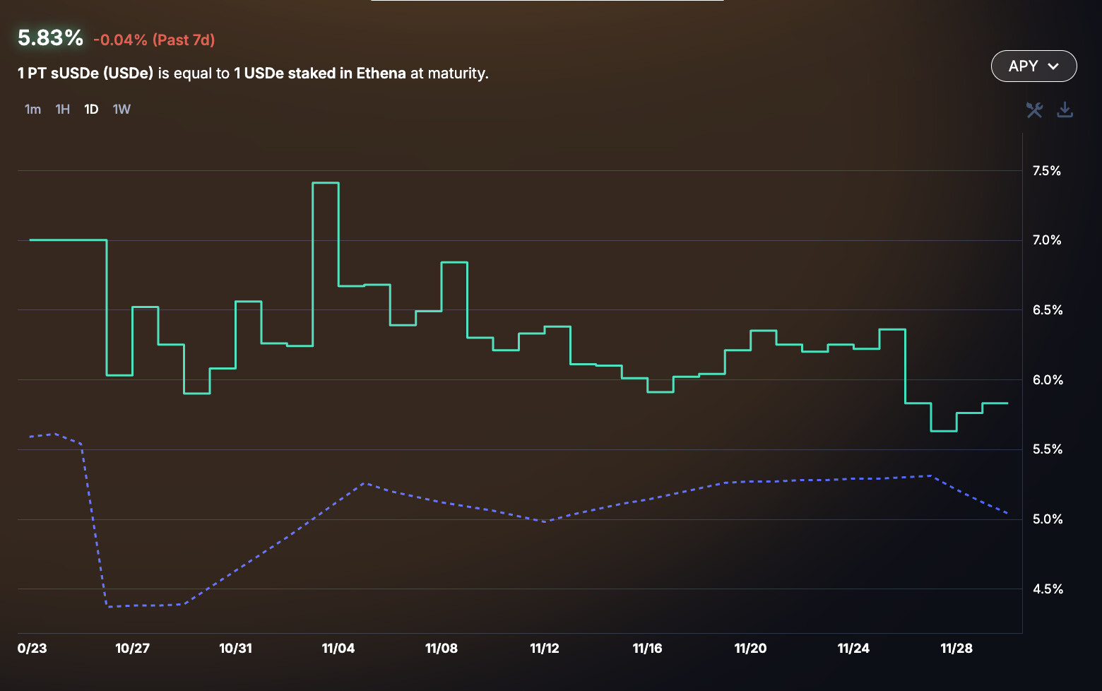 PT-sUSDe’s implied yield has experienced a moderate decline in the recent week, dropping by approximately 50 basis points, currently standing at 5.83% implied yield.