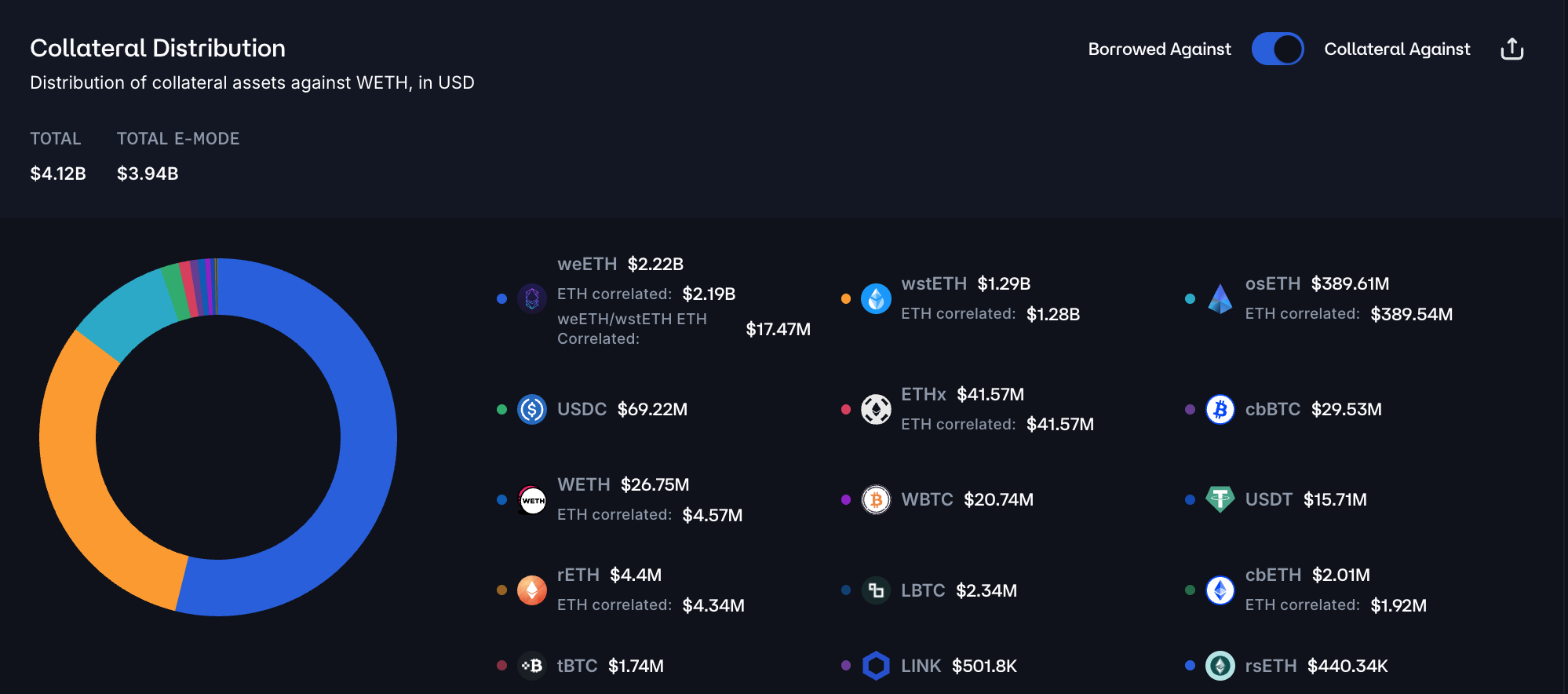 The majority of WETH debt is backed by weETH and wstETH, accounting for over 85% of all posted collateral. Given the high correlation of the assets, the liquidation risk is minimal.