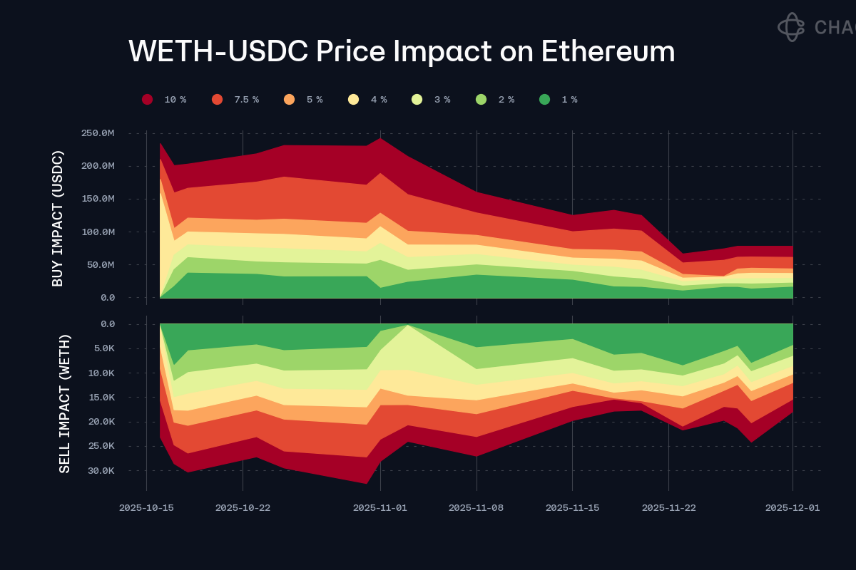 Given the limited risk on the borrow side of the WETH market, which is driven by the strong correlation between collateral and debt assets, the primary liquidity risk stems from USDC debt backed by WETH. At the time of writing, Ethereum’s liquidity profile supports swapping over 10,000 WETH for USDC with an estimated price impact of 3.5%.