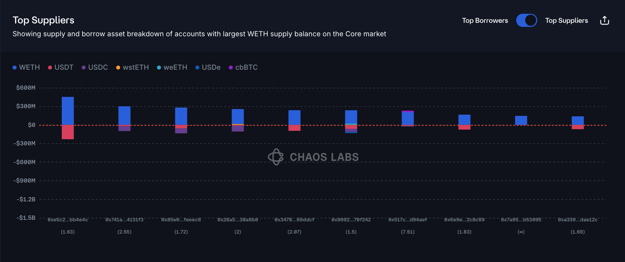 The supply distribution of WETH exhibits substantial concentration risk, as the top two users account for approximately 11% of the total, while the top 10 users have a cumulative share of 31%. Most of the suppliers have debt posted against the collateral, which is primarily denominated in USDT and USDC. As can be observed on the plot below, the distribution of health factors is relatively broad and contained in the safe 1.5-7.51 range, limiting the probability of liquidations.