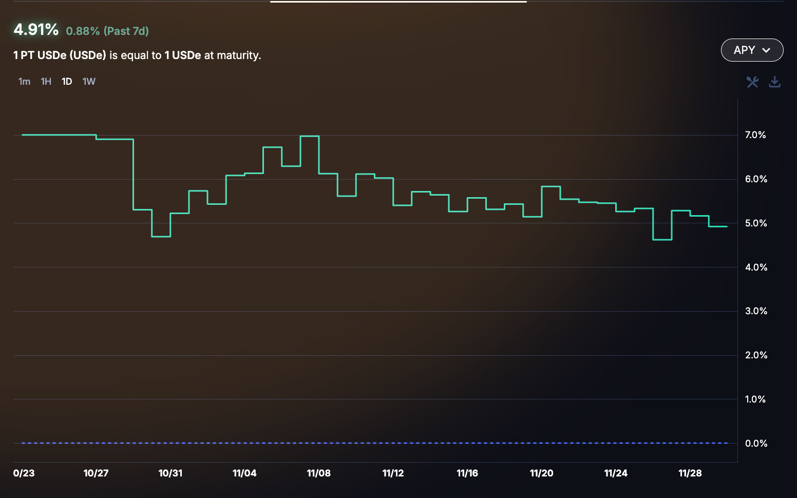 Similar market dynamics can be observed in the PT-USDe market, where the implied yield has decreased by 40 basis points over the past week.