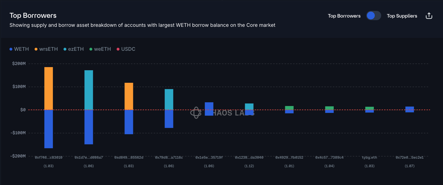 ezETH supply currently exhibits moderate concentration. The majority of users are holding substantial WETH or wstETH debt with lower-band health factors in the 1.02-1.3 range. It is important to note that the top supplier does not hold any debt, signaling potential positioning for further WETH borrowing, as ezETH does not earn any supply yield.