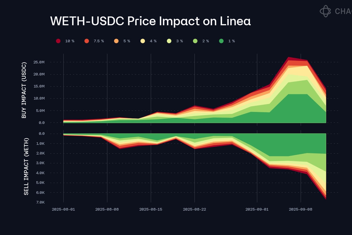WETH on-chain liquidity has increased substantially in recent days. At the moment, a sell order of 5,000 WETH would incur 3% slippage, supporting an increase in the supply and borrow caps.