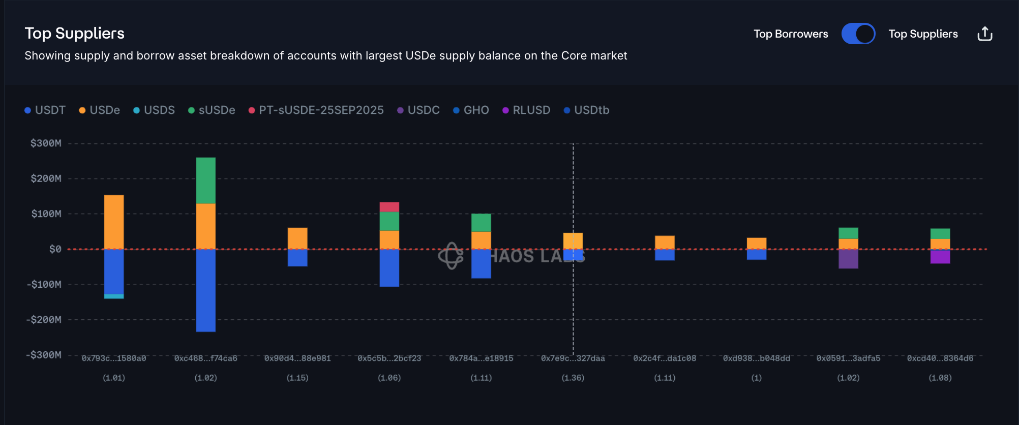 USDe currently collateralizes over 1.3 billion in stablecoin debt, facilitated by a set of E-modes that enhance capital efficiency. Despite this substantial market size, the risk of liquidations and bad debt remains minimal because the supplied and borrowed stablecoins maintain tight price correlation.