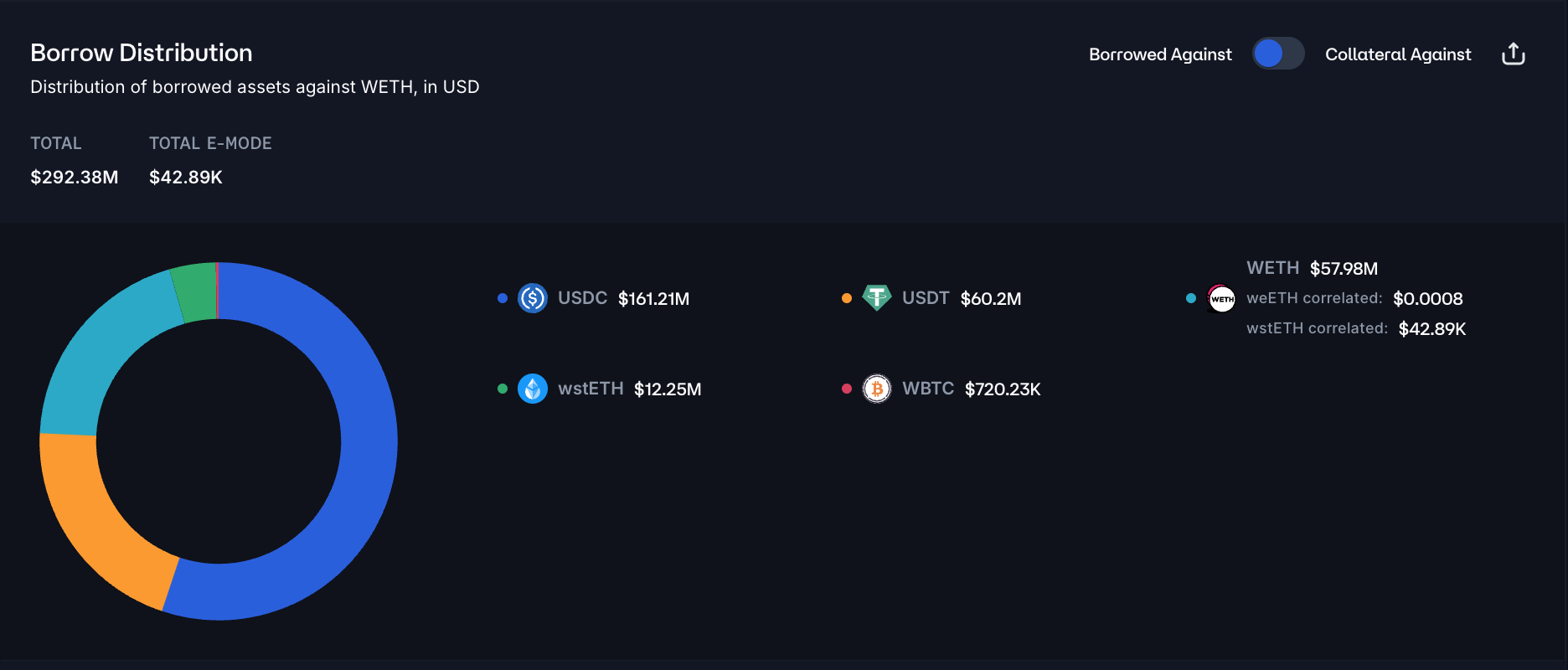 As mentioned, the overwhelming majority of WETH is collateralized with LRTs (wrsETH, ezETH, weETH), minimizing the liquidation risks as the debt and collateral assets are highly correlated in price.