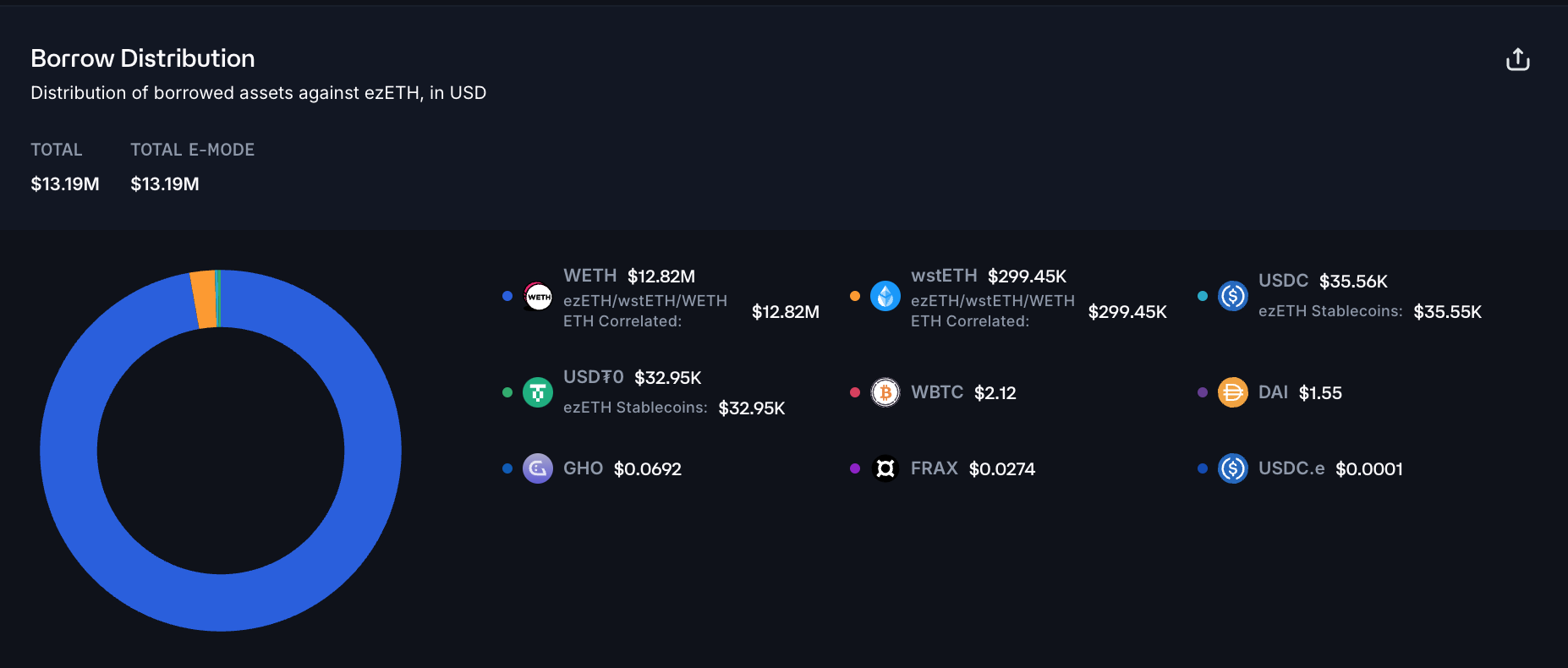 As mentioned, ezETH is primarily used to facilitate WETH and wstETH borrowing. Users execute leveraged restaking strategies, earning the underlying yield on LRTs while paying the borrow rates. Due to the high correlation between debt and collateral assets, the liquidation risk is minimal.