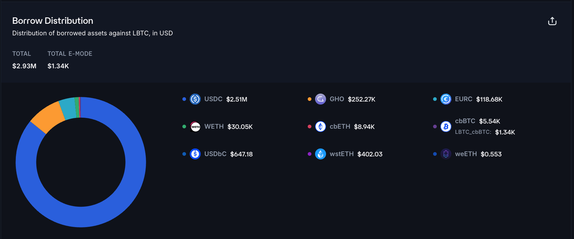 Out of 2.9 million borrowed against LBTC, USDC represents over 86%, limiting the market’s exposure to additional volatility.