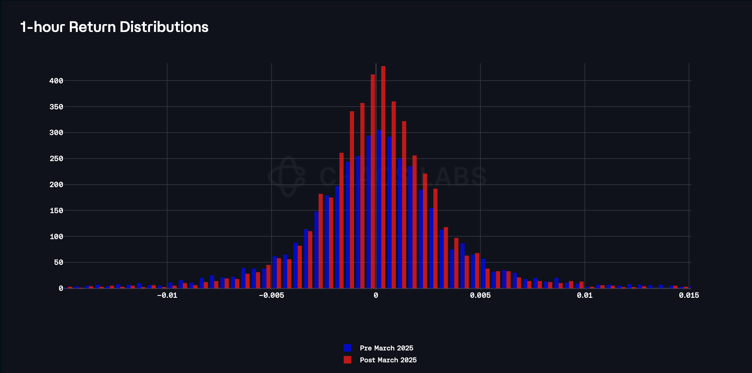 The distribution of one-hour returns before and after March 2025 highlights increased stability in the latter period. While the center of the distribution becomes slightly denser, the post-March profile (red) reflects a lower absolute frequency of large price changes, suggesting increased market stability for cbBTC pools on Base and, consequently, thinner tails.