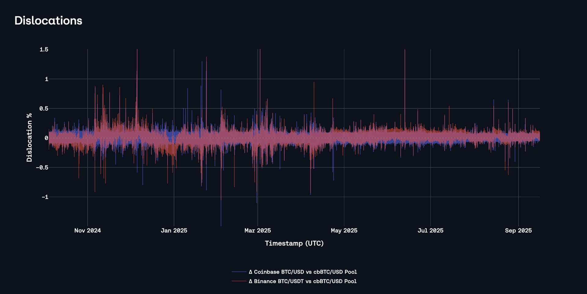 Dislocation analysis of cbBTC’s DEX pool price and the BTC/USD oracle shows that pricing discrepancies remain consistently centered near zero, with more than 95% of observations within ±1%. This indicates tight alignment between on-chain pricing and the oracle feed, reducing the risk of oracle mispricing and minimizing the chance of forced liquidations triggered by technical deviations rather than price discovery.