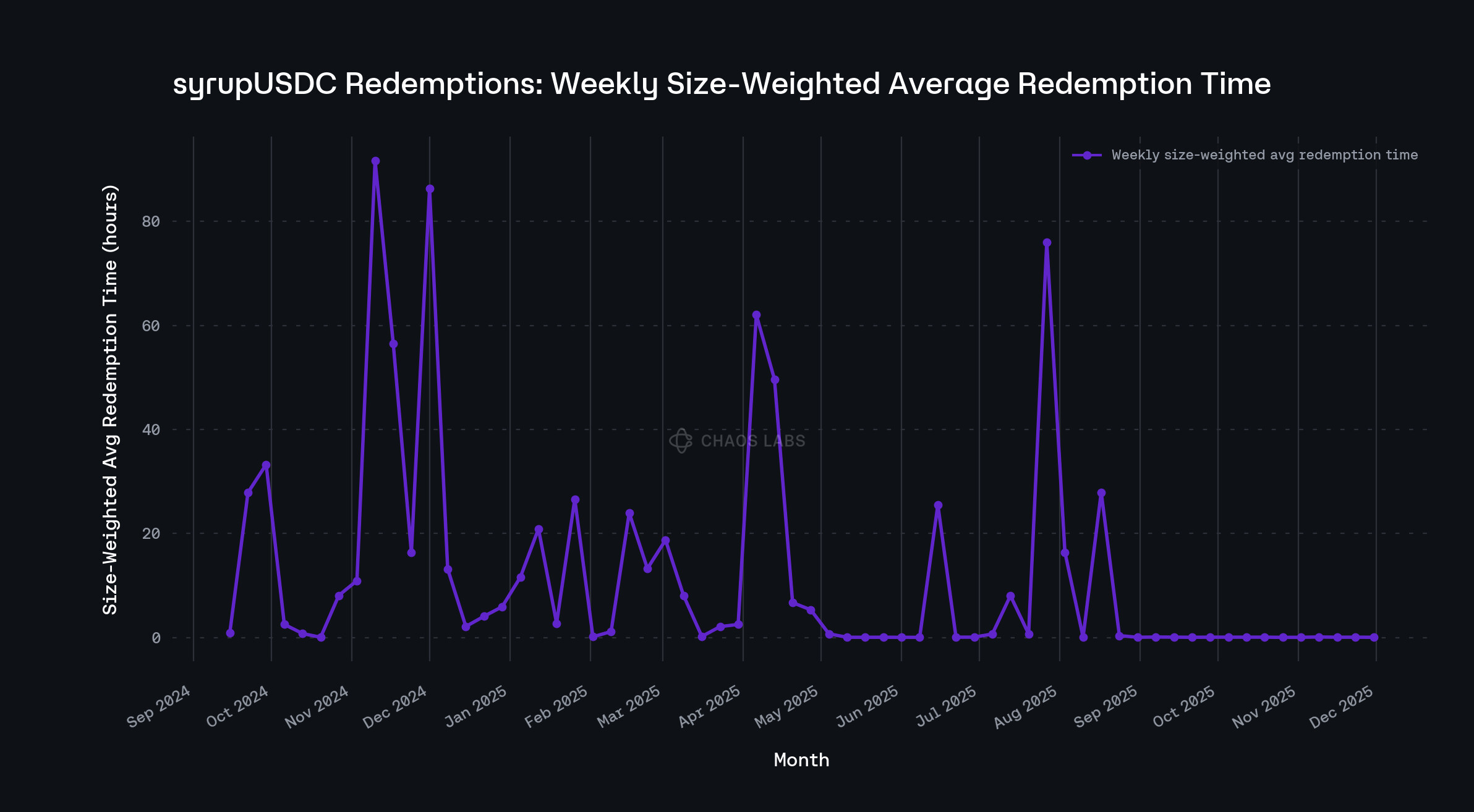 Then, examining weekly redemption dynamics, the chart below reports the average processing time for all events between September 2024 and December 2025. While modest week-to-week fluctuations are observable, redemption latency remains generally low throughout the period. Notably, over the past three months, the average redemption time for syrupUSDC has remained firmly below one hour.