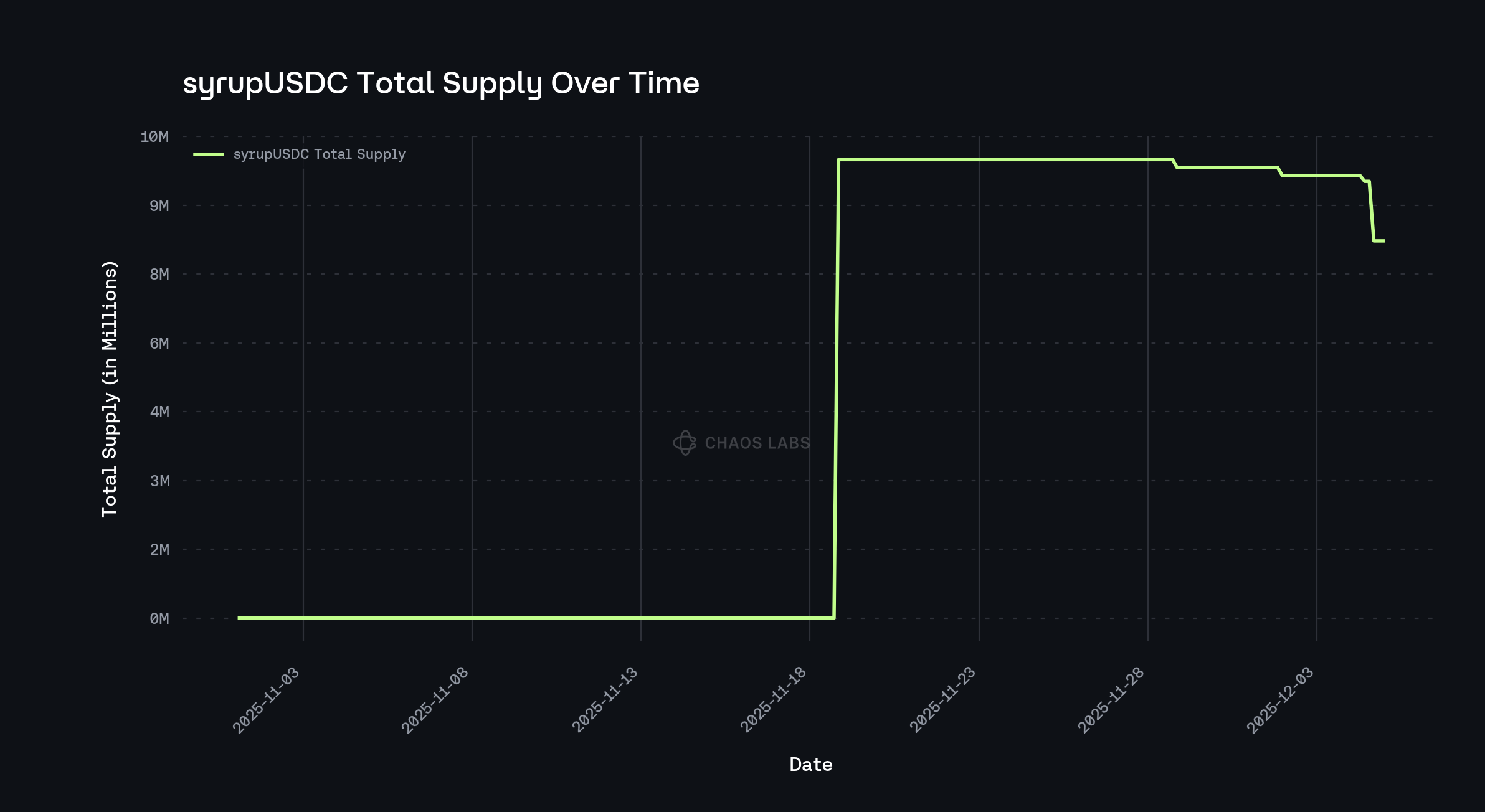 syrupUSDC’s liquidity is currently concentrated in two primary venues: the Fluid syrupUSDC/USDC liquidity pool with a $10M TVL and the Aerodrome syrupUSDC/USDC liquidity pool with a $9.8M TVL. Together, these two pools account for 99% of the total syrupUSDC supply on Base. Below, we show the aggregated liquidity of syrupUSDC across these two pools. As illustrated, syrupUSDC liquidity has been on a steady upward trend, with a notable increase toward the end of November 2025.