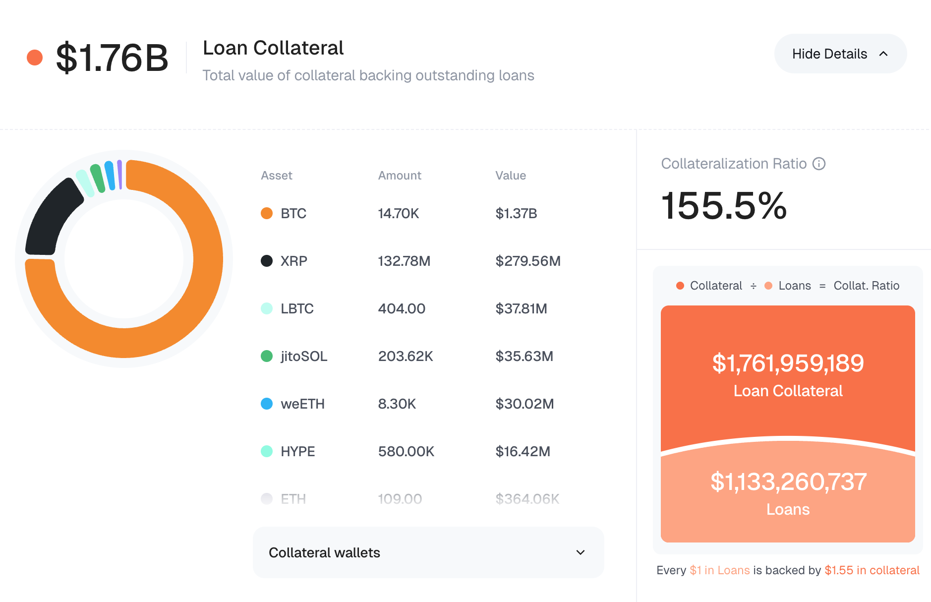 Collateral backing Maple’s USDC and USDT loan books currently totals $1.76B, against $1.15B in outstanding stablecoin loans, implying an aggregate collateralization ratio of 153%. BTC remains the dominant form of collateral at 77.4% of the total, or roughly $1.37B. In addition to loan collateral, Maple pools hold approximately $1.17B in DeFi liquidity deployed across secondary strategies; these positions function as liquid reserves that can be recalled to facilitate redemptions and have grown meaningfully since our prior review. Unlike syrupUSDT, none of syrupUSDC’s backing is deployed on Aave, so it does not carry the reflexive liquidity risk discussed in our syrupUSDT analysis.