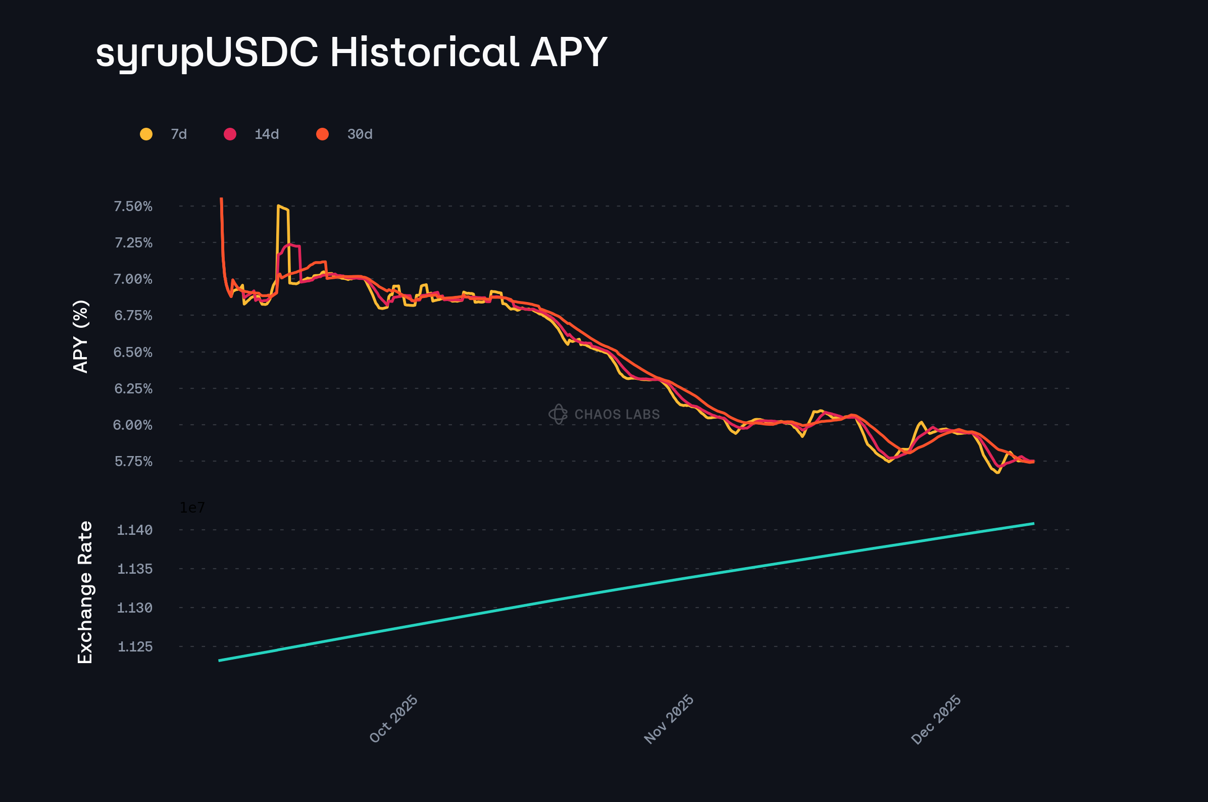 Chaos Labs has conducted a comprehensive technical evaluation of syrupUSDC on Ethereum; the full assessment can be found here. At a high level, syrupUSDC is Maple Finance’s yield-bearing representation of USDC deposited into the Maple credit pool. It is an ERC-4626 vault token that tokenizes a pro-rata claim on a diversified portfolio of institutional loans originated and managed by Maple Direct. Users mint syrupUSDC by supplying USDC to the pool and receive vault shares whose value increases as interest accrues on both fixed-term and open-term credit exposures.