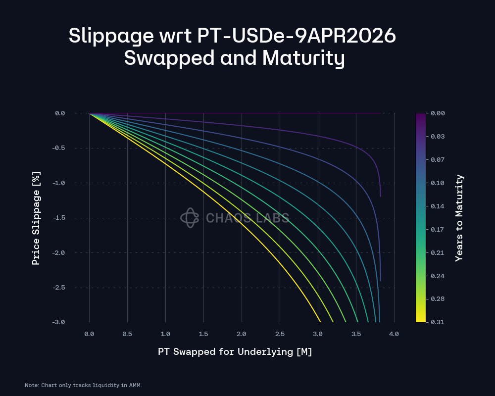 With PT-sUSDe-9APR2026 and PT-USDe-9APR2026, liquidity depends on both the underlying USDe markets and Pendle’s PT/SY AMM pool. Considering the fact that the market emerged approximately seven days ago, the liquidity depth profiles can be characterized as strong. The plots below represent the amount of liquidity available under 3% slippage as the market approaches expiry, given the current liquidity distribution in the AMM. With the maturity of the market, the price impact associated with swapping PT becomes less extreme. This trend is especially pronounced for assets with lower scalarRoot values, i.e., a greater expected implied yield fluctuation, and they tend to have more variance in liquidity concentration. Supported by on-chain liquidity in the Pendle AMM, the market currently facilitates swaps of up to $10 million and $4 million with less than 3% slippage in sUSDe and USDe PTs, respectively.