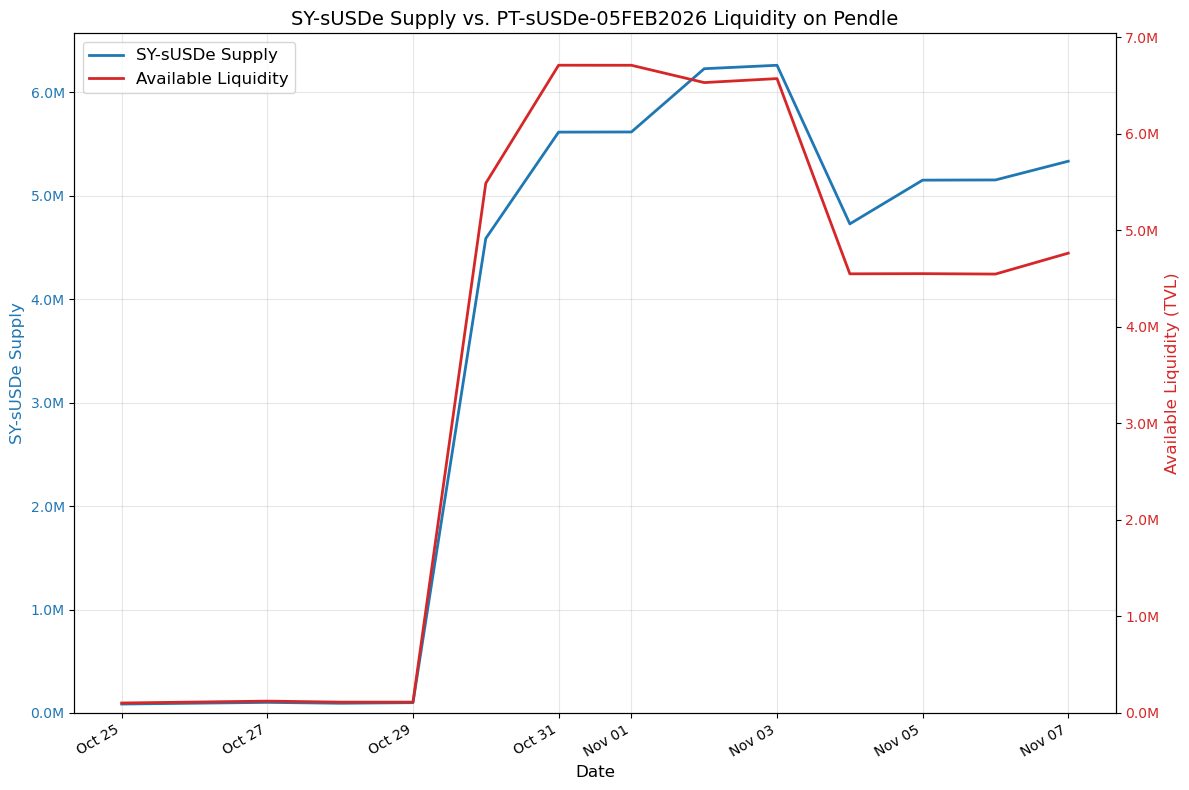 The PT-sUSDe-05FEB2026 maturity pool has demonstrated sustained growth since its inception, while the PT-USDe-05FEB2026 liquidity growth has been more limited. As the November PTs mature, we expect the liquidity to rotate to the February pools as has happened with previous PTs.
