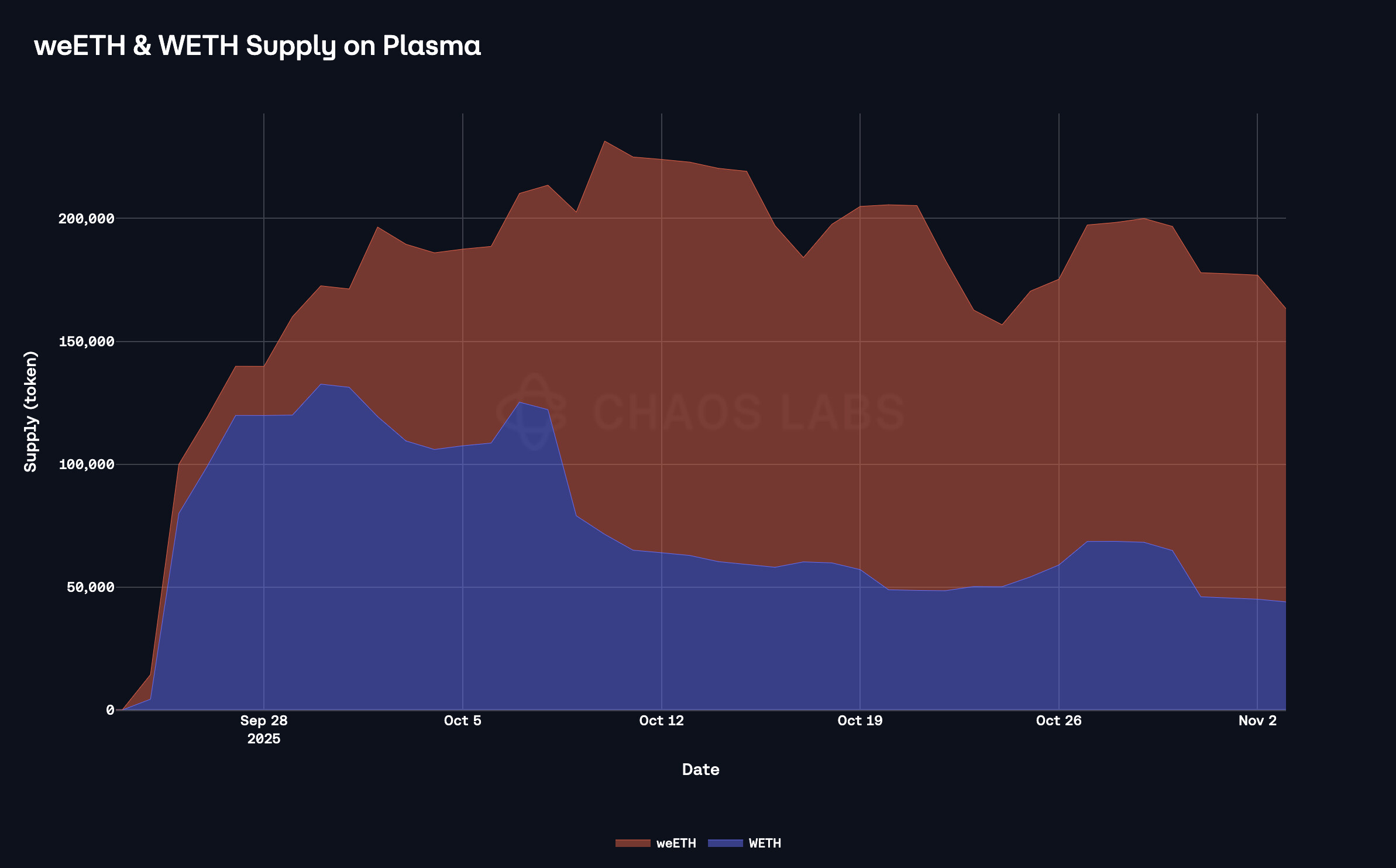 As market conditions have evolved, Plasma has improved in terms of liquidity depth, lending volumes, and overall efficiency. Specifically, the slippage on a 5,000 weETH sell order is limited to 3.5%. The aggregate supply of weETH on the instance currently exceeds $460 million (~100,000 tokens), surpassing WETH, which has a total supply of $160 million.