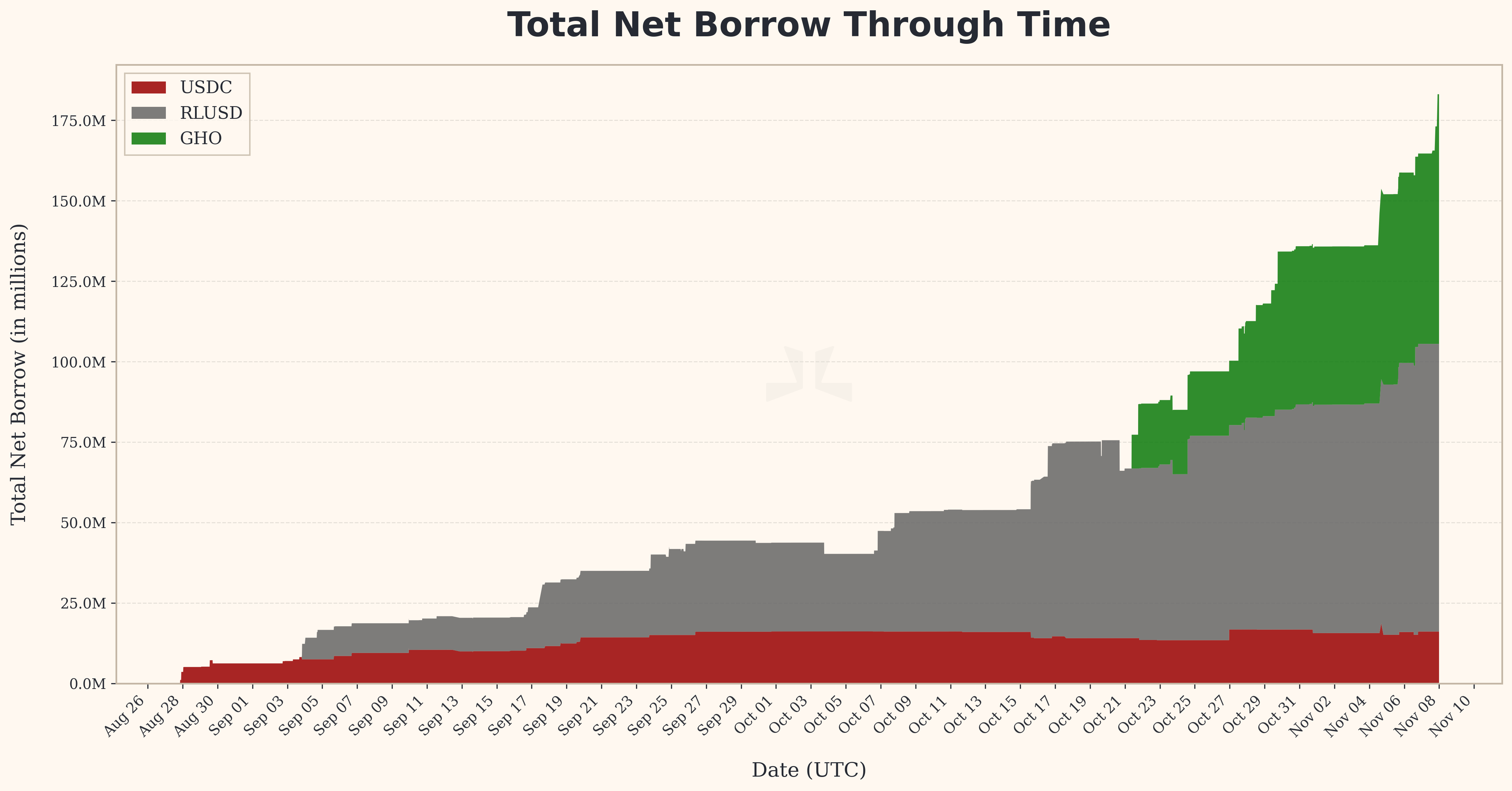 Large influxes of RLUSD and USDC mark the stablecoin supply. GHO is capped at 1m$ via a facilitator, with no room to deposit external GHO. Its comparatively high borrowing rate compared to the other stablecoins explains its lack of current usage.