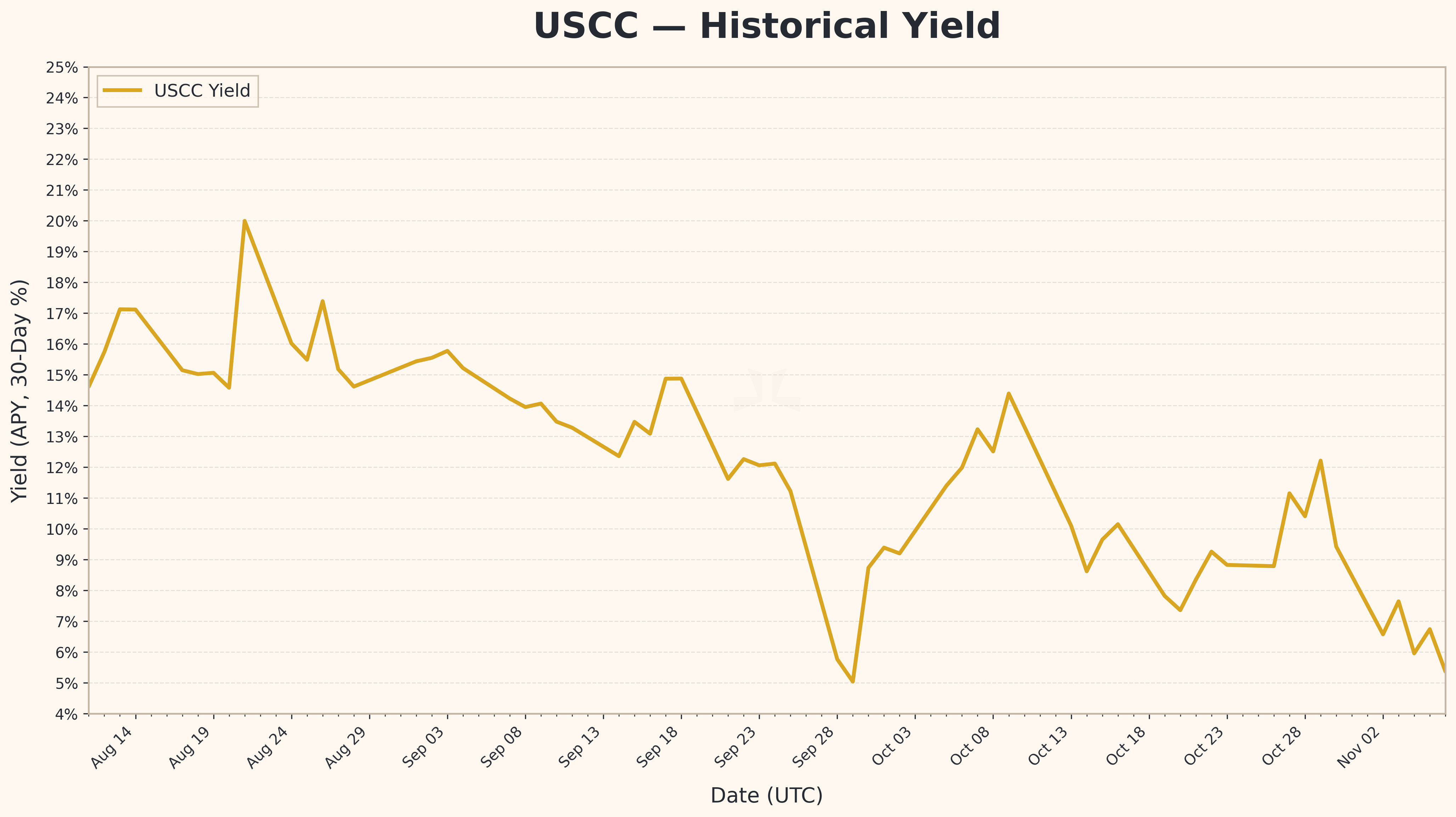 Driven by a compelling APY of ~15.78%, USCC is the dominant RWA supplied to Horizon, with the market attracting 7.5% of its total supply in the first week. The fund generates this return via a market-neutral strategy that captures basis by shorting CME-listed futures contracts, such as SOL Future SEP25 and XRP Future SEP25, while hedging price exposure. Because this yield significantly exceeds the Treasury rates that benchmark stablecoin returns, it is a primary incentive for suppliers.