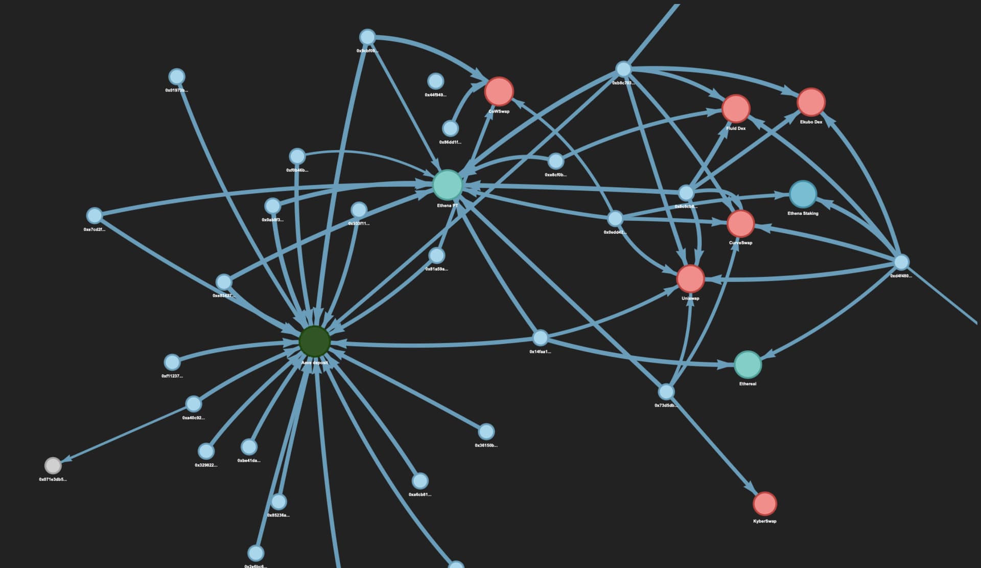 To better understand and quantify the risks at maturity, we mapped the on-chain flow of capital from wallets that withdrew USDe from matured Pendle SY pools. Using network graphs, we can visualize the primary destinations for these funds. The small blue nodes represent individual wallets, while the larger, colored hubs represent the primary actions taken: Red Hubs signify sales on DEXs, Blue Hubs represent capital retention within the ecosystem, such as migrating to new maturities or staking, and the Green Hub specifically denotes deposits into Aave. Analyzing major maturity dates reveals a clear evolution in user behavior over time.