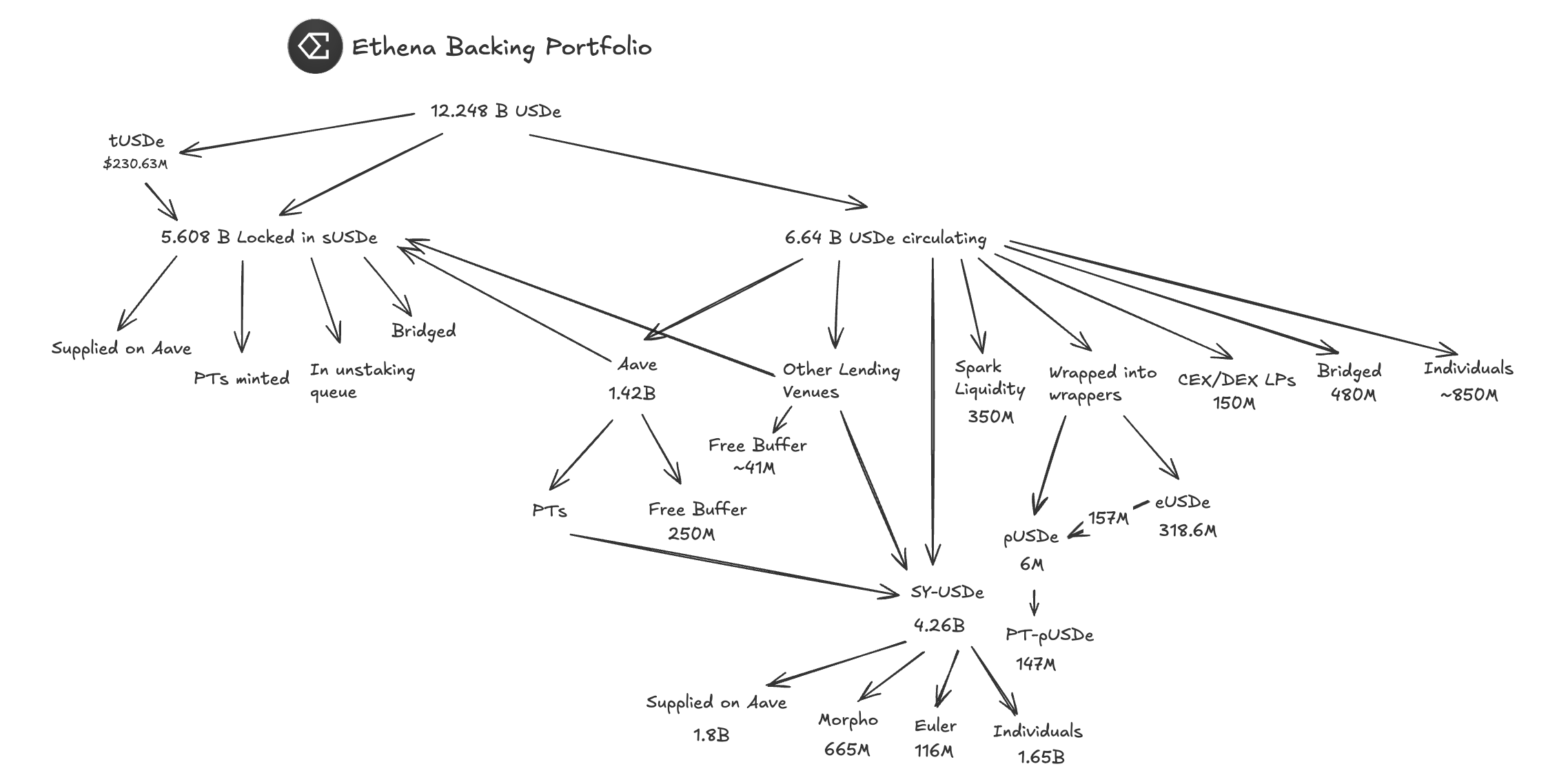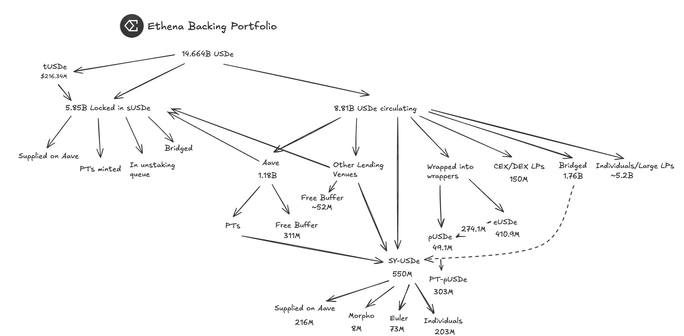 When analyzing USDe flows, we can divide them into two categories: freely circulating USDe and locked USDe. On October 9, 2025, out of the 14.66B total USDe supply, 5.85B was staked into sUSDe, directly or via a tUSDe deposit vault.